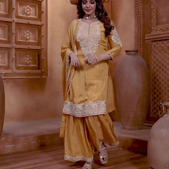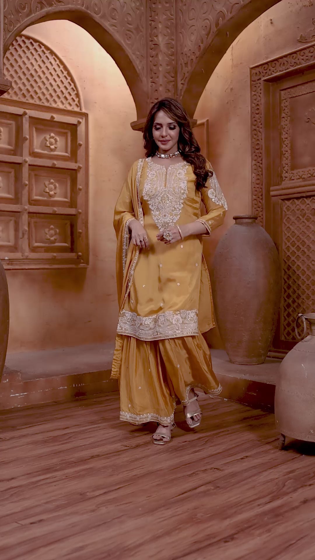 Add a burst of sunshine to your festive wardrobe with this vibrant mustard yellow plazo set. The kurta is beautifully adorned with intricate pearl and sequin embroidery, while the flowy sharara-style palazzo and soft dupatta add a graceful touch. Perfect for weddings, Haldi functions, and festive soirées.