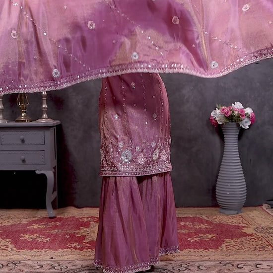 Grace meets sophistication in this ethereal mauve plazo set, perfect for day celebrations and elegant evenings. The kurta features intricate pastel floral thread embroidery combined with delicate mirror work, adding a soft shimmer. Paired with a wide-legged palazzo and a sheer organza dupatta with embroidered borders, this ensemble is a blend of subtle charm and festive flair.