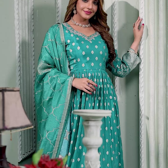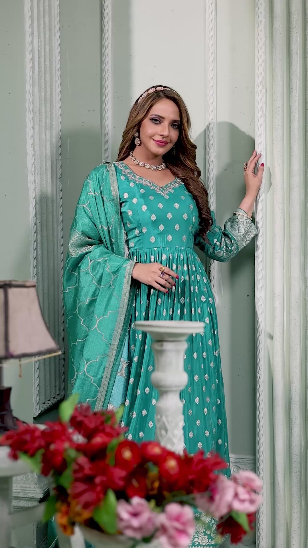Grace meets grandeur in this Aqua Blue Anarkali, adorned with antique gold thread embroidery and delicate buta motifs throughout. The ensemble is elevated with a regal Banarasi brocade dupatta featuring traditional paisley patterns and rich zari borders, perfect for weddings and formal festivities.