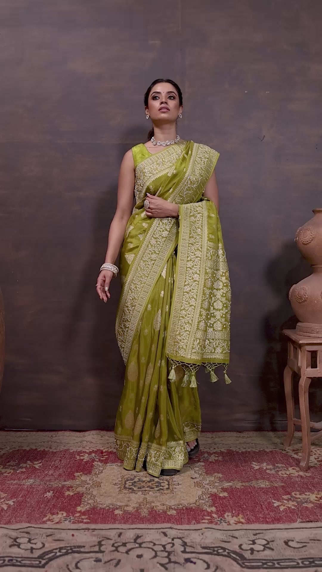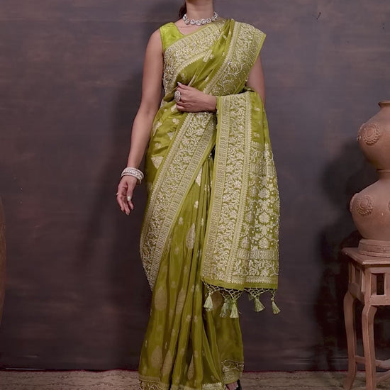 Step into the spotlight with this ethereal Mahendi Tissue saree, designed to exude grace and richness. The fabric gleams with intricate golden zari weaving, featuring traditional floral buttas and a delicately patterned pallu. This saree does not include a blouse piece — the model blouse shown is for styling reference only.