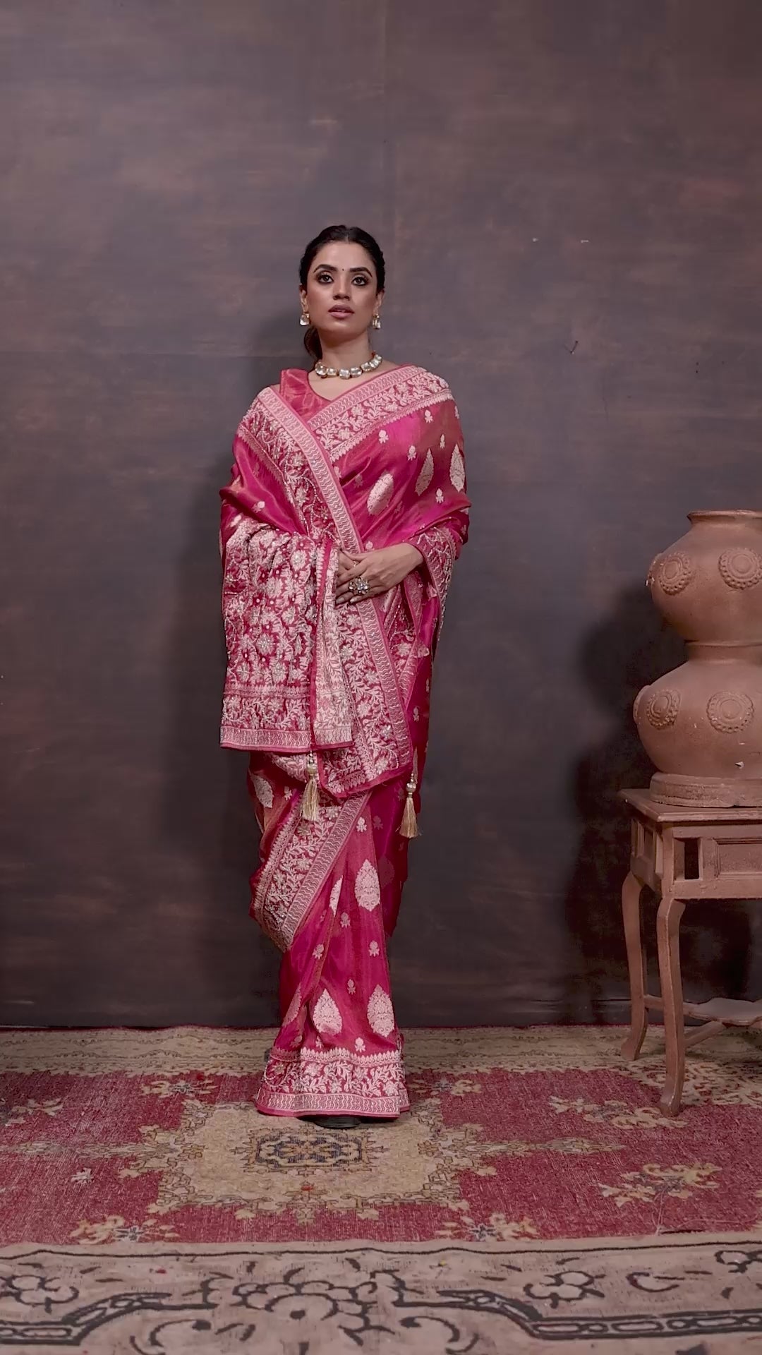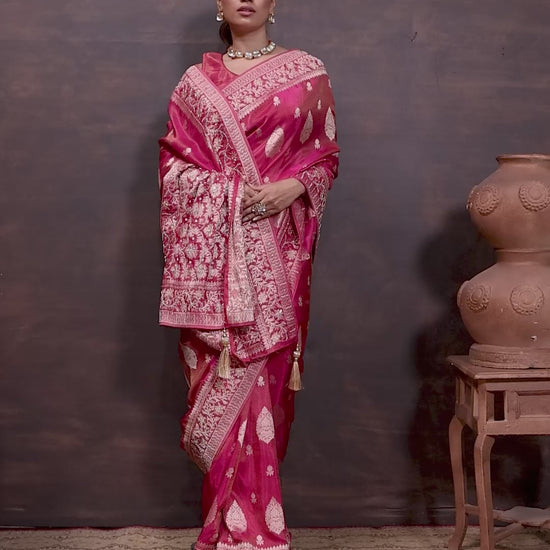 Step into the spotlight with this ethereal Pink Tissue saree, designed to exude grace and richness. The fabric gleams with intricate golden zari weaving, featuring traditional floral buttas and a delicately patterned pallu. This saree does not include a blouse piece — the model blouse shown is for styling reference only.