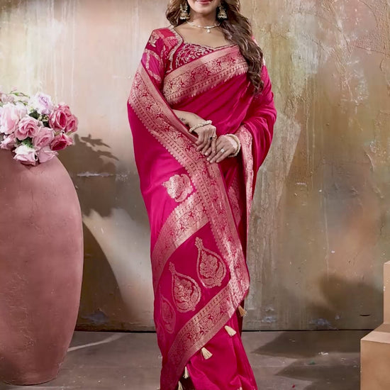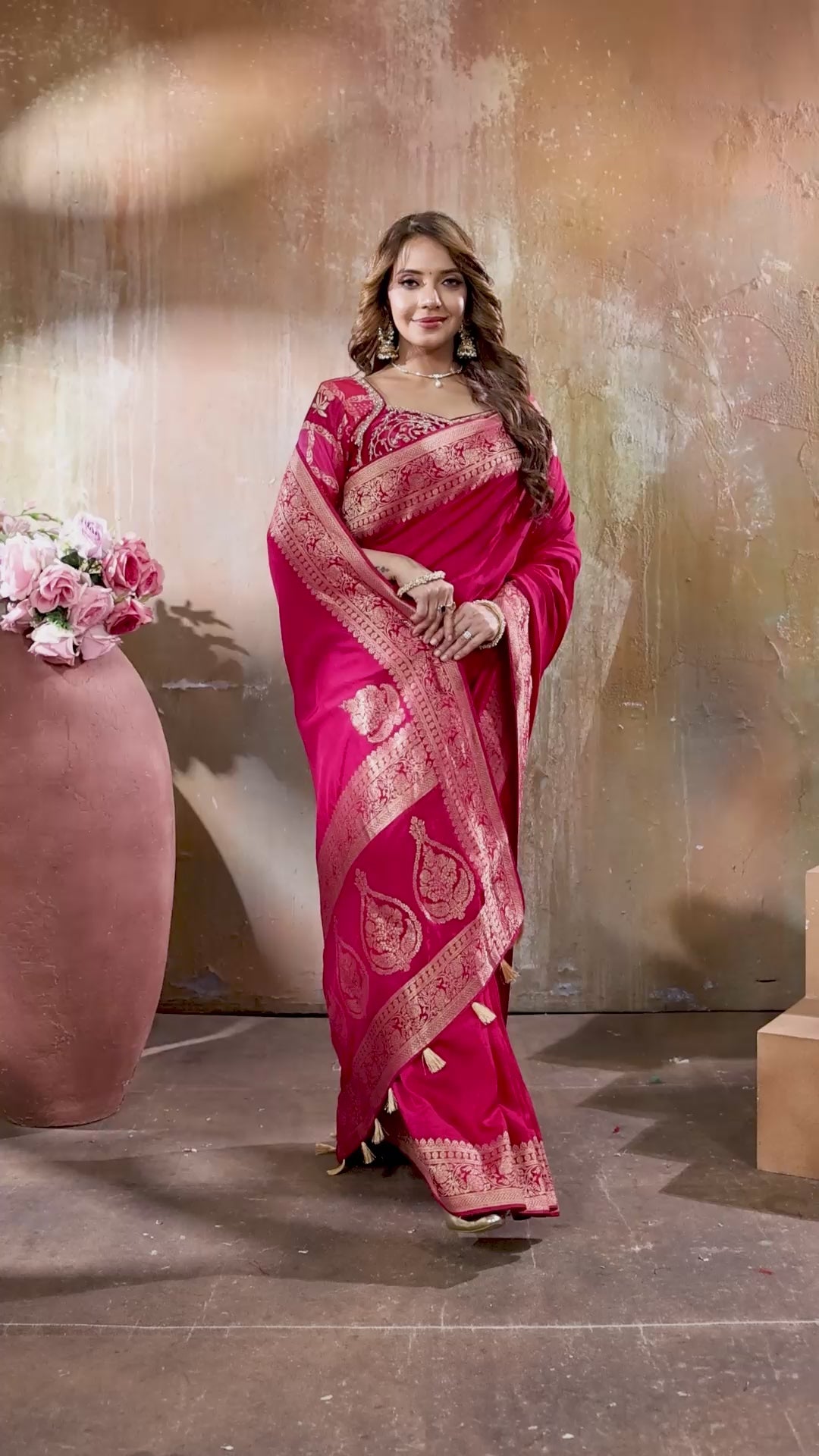 Make a grand statement with this pink Banarasi Silk Saree, richly woven with traditional gold zari motifs and paired with a heavily embroidered designer blouse. The intricate patterns and vibrant red hue evoke timeless grace, making it a perfect pick for weddings and festive occasions.