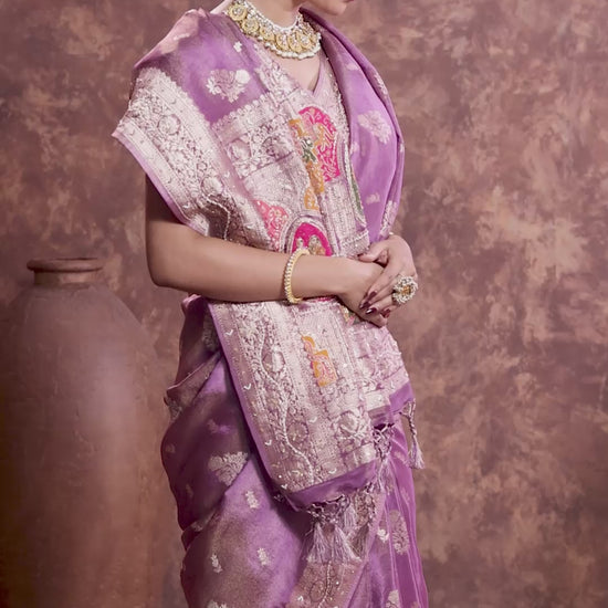 Channel timeless elegance in this Magenta Tissue Saree, featuring a luminous sheen and delicately hand-embroidered border that exudes refined sophistication. Intricate multicolored threadwork motifs along the pallu and lower half add artistic flair, making this saree a perfect blend of tradition and modern grace. This saree does not include a blouse piece — the model blouse shown is for styling reference only.