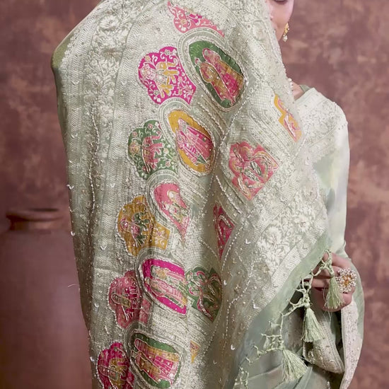 Channel timeless elegance in this Mehendi Tissue Saree, featuring a luminous sheen and delicately hand-embroidered border that exudes refined sophistication. Intricate multicolored threadwork motifs along the pallu and lower half add artistic flair, making this saree a perfect blend of tradition and modern grace. This saree does not include a blouse piece — the model blouse shown is for styling reference only.