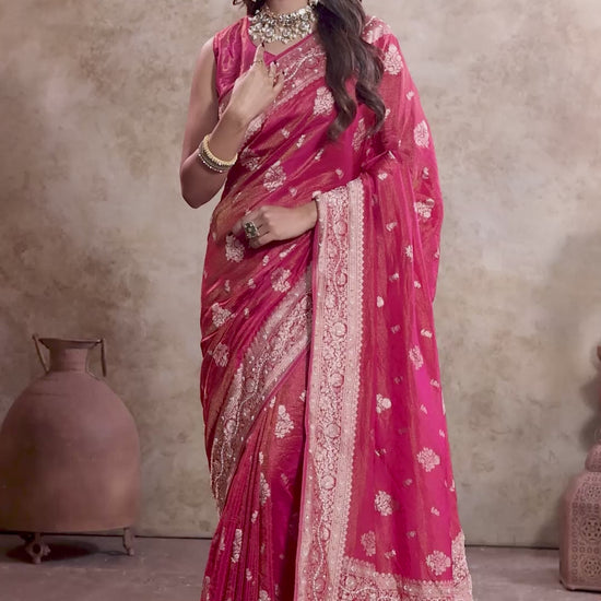 Channel timeless elegance in this pink, featuring a luminous sheen and delicately hand-embroidered border that exudes refined sophistication. Intricate multicolored threadwork motifs along the pallu and lower half add artistic flair, making this saree a perfect blend of tradition and modern grace. This saree does not include a blouse piece — the model blouse shown is for styling reference only.