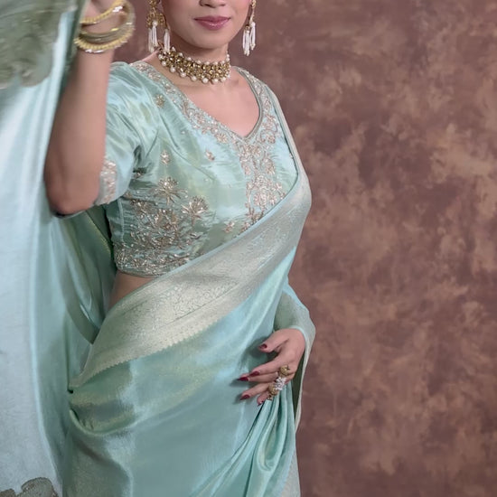 Drape yourself in timeless charm with this luxurious Dusty Blue saree, an ode to understated elegance. Crafted in tissue, the saree features a gleaming Zari border with intricate woven patterns and tassel detailing. The blouse, with its V-neckline and ornate embroidery, complements the saree beautifully, making this ensemble perfect for weddings, receptions, or festive soirées. Its graceful drape and soft shimmer ensure you stand out while embracing tradition with poise.