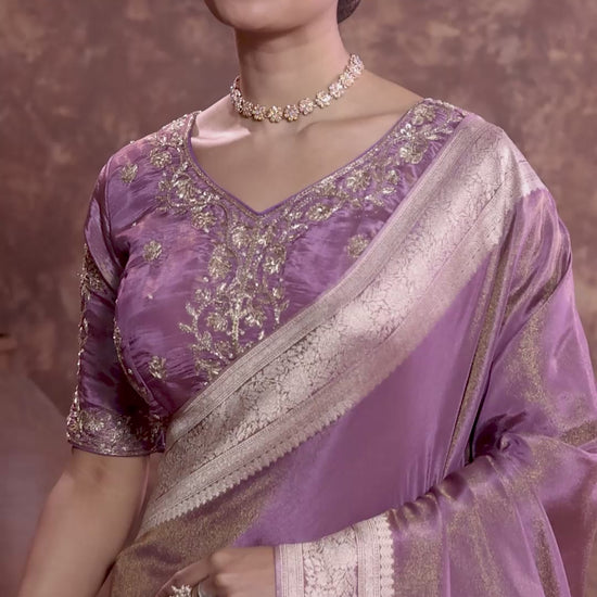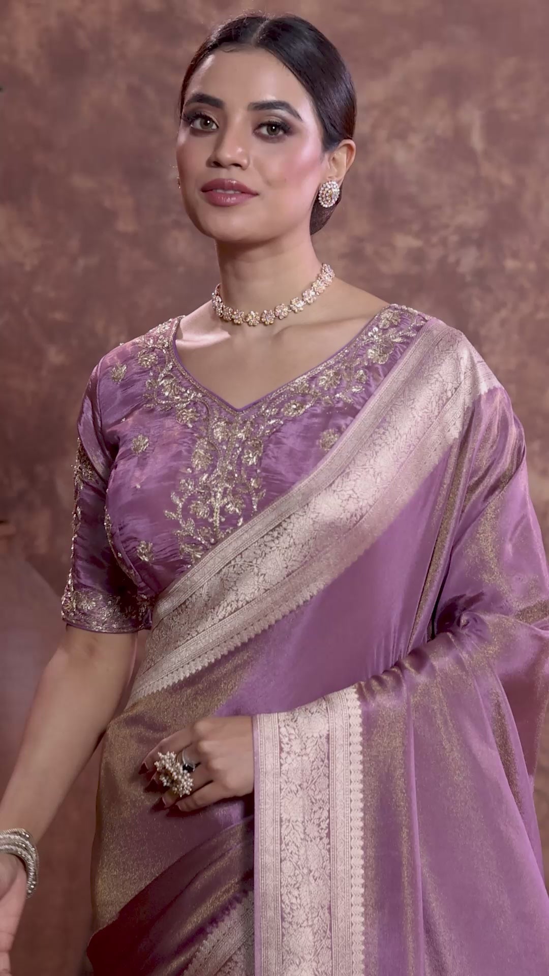 Drape yourself in timeless charm with this luxurious Lavender saree, an ode to understated elegance. Crafted in Tissue, the saree features a gleaming zari border with intricate woven patterns and tassel detailing. The blouse, with its V-neckline and ornate embroidery, complements the saree beautifully, making this ensemble perfect for weddings, receptions, or festive soirées. Its graceful drape and soft shimmer ensure you stand out while embracing tradition with poise.