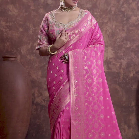 Drape yourself in timeless elegance with this enchanting Pink saree. Crafted in a luxurious silk blend, it features exquisite gold zari work across the body, pallu, and border. The ornate patterns and sheen of the weave reflect rich cultural heritage, making it ideal for weddings, receptions, and festive events.
