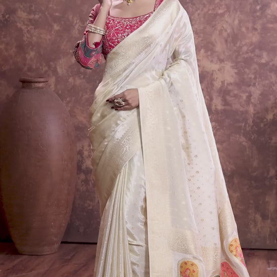 Step into heritage charm with this graceful off-white Banarasi saree, adorned with intricate zari weaving and unique traditional figure motifs on the pallu. Crafted from a luxurious silk blend, it exudes regality and timeless appeal. The subtle golden shine, paired with cultural artistry, makes it perfect for festive occasions, weddings, and cultural events.