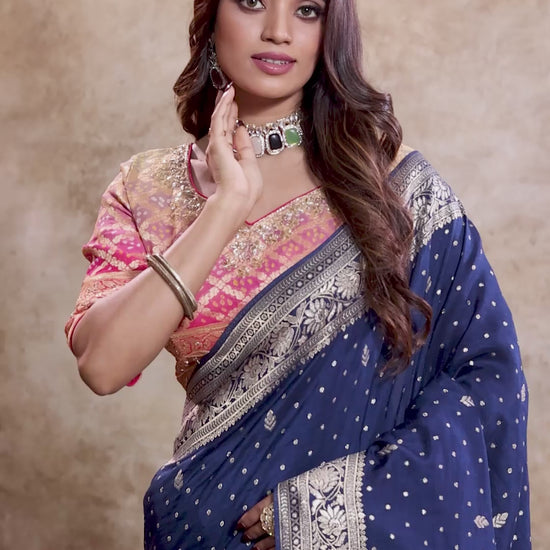 Immerse yourself in timeless sophistication with this navy blue Banarasi saree, crafted from a lustrous silk blend and adorned with intricate silver zari weaving. The elegant floral motifs and ornamental border lend it a regal charm, while the contrast stitched blouse adds a vibrant modern touch. This saree is a perfect pick for evening weddings, receptions, and grand festive occasions.