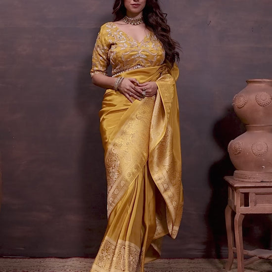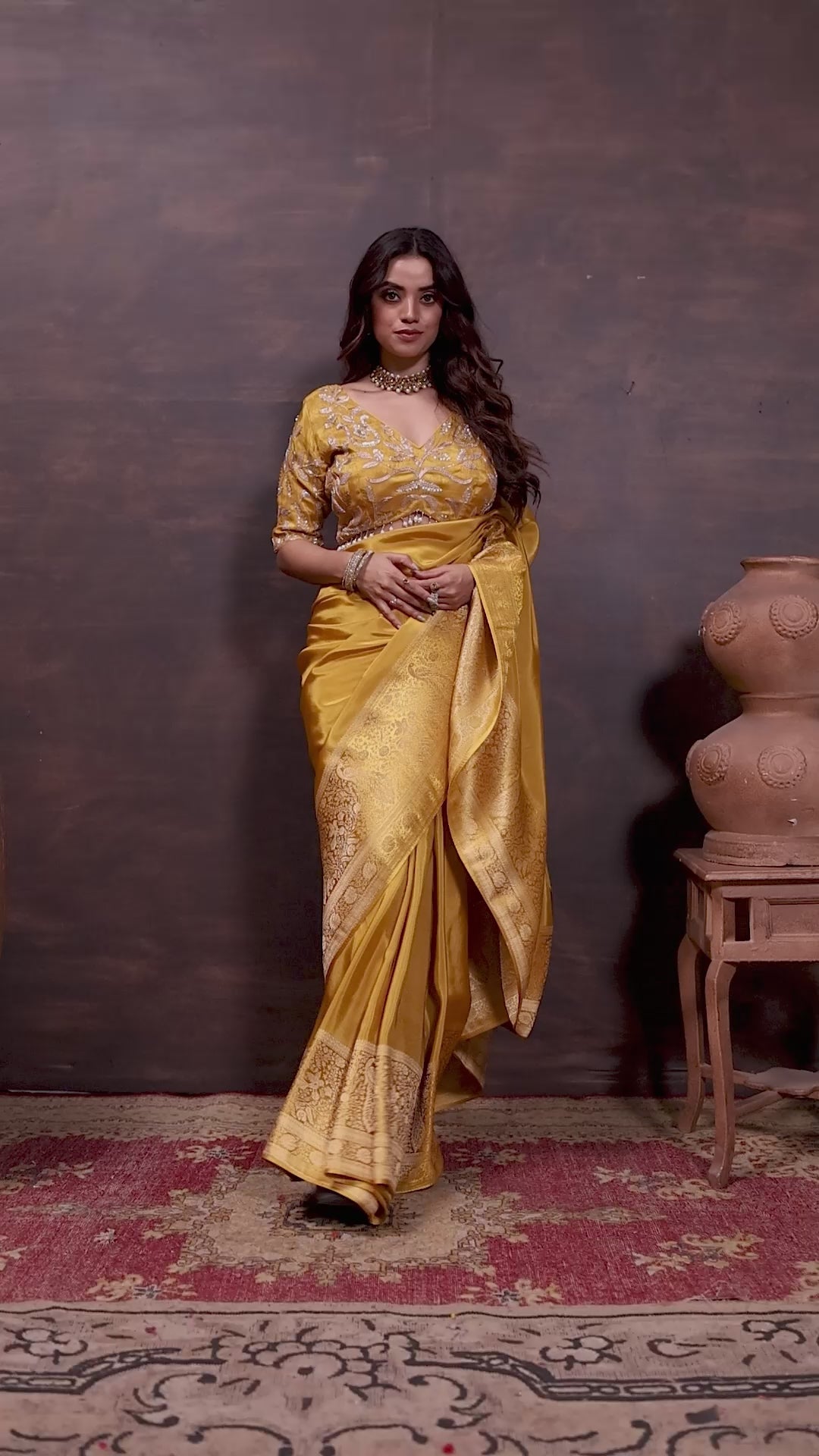 This timeless Mustard Tissue saree features intricate woven motifs and a rich pallu, paired perfectly with a heavily embroidered blouse. The lustrous finish and regal design make it an ideal choice for weddings and festive occasions.