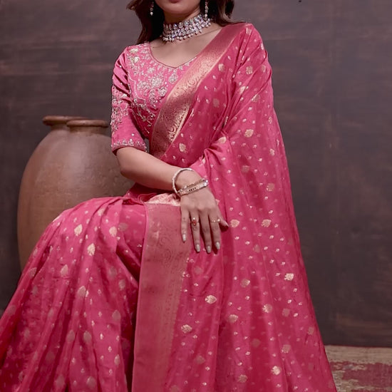 Turn heads in this Vibrant Pink blue zari Banarasi silk saree featuring exquisite golden motifs and a rich pallu design. The look is completed with a heavily embroidered stitched blouse that adds a festive and elegant touch – perfect for special occasions.